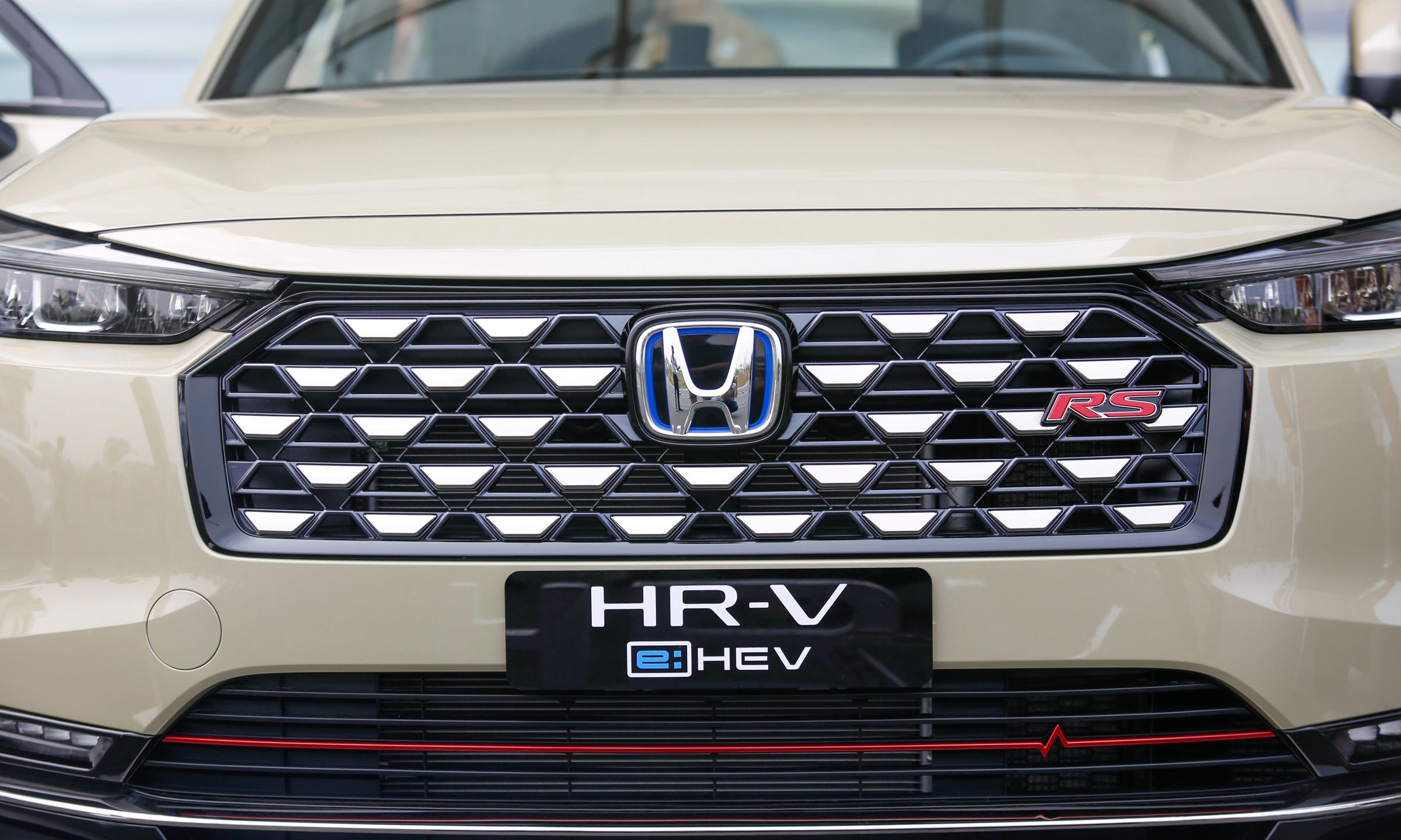 Bản HR-V e:HEV có viền chrome dày + logo Hybrid xanh, lưới đen mờ sang trọng.